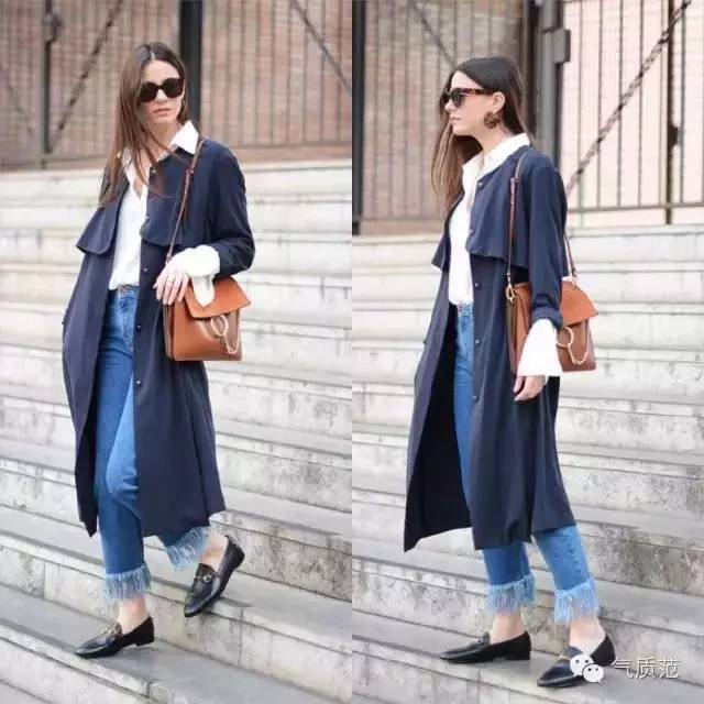如果已经有卡其色的风衣,不妨尝试下其他的百搭色,藏青色的长款风衣 搭配时髦的须边牛仔裤和乐福鞋,很复古。上身选择了简单的白衬衫,露出今年流行的开口大袖子,一个棕色麂皮复古包包,这一身花了心思但看起来又不会用力过猛。