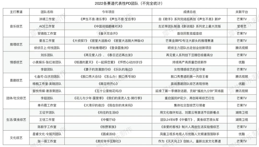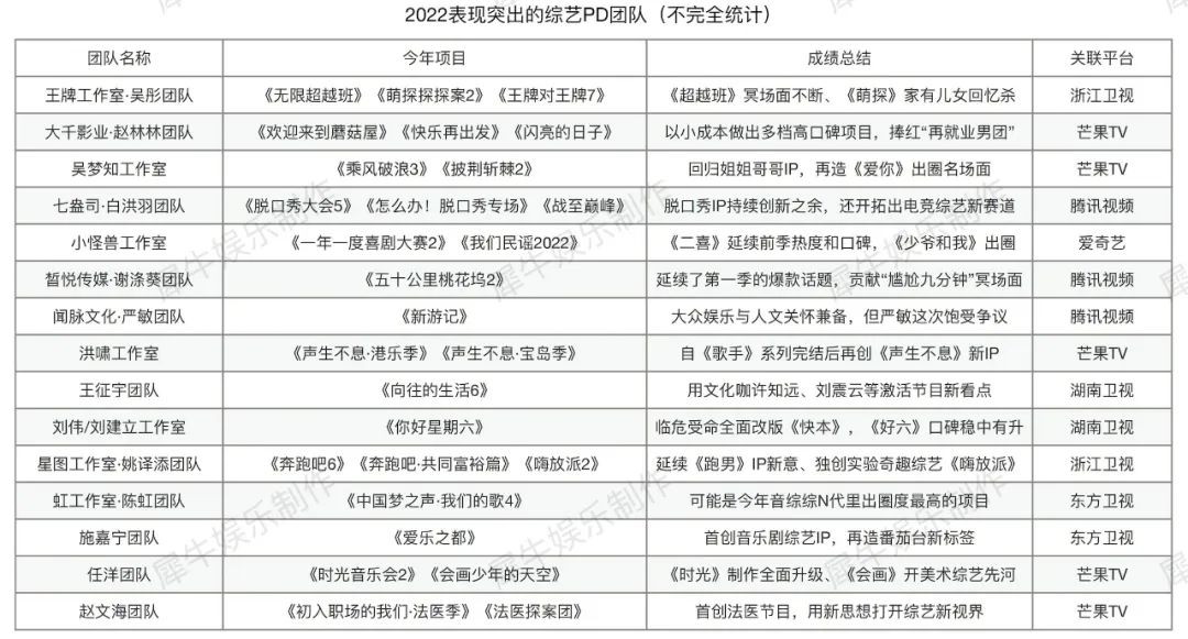 想了很久要从什么角度总结2022,直到犀牛君在梳理这些综艺制作团队的过程中找到了答案。无论大环境如何变化万千,综艺市场可持续发展的终极奥义,是这个行业始终拥有一群默默坚守内容创新的PD团队们。