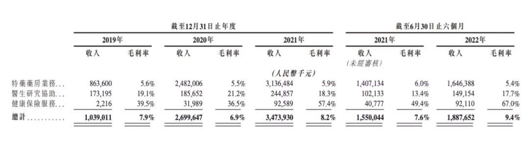 根据招股书,2019年-2021年及2022上半年,思派健康来自特药药房业务服务的收入分别占总收入的83.1%、91.9%、90.3%及87.2%,但毛利率却仅有5.6%、5.5%、5.9%及5.4%。