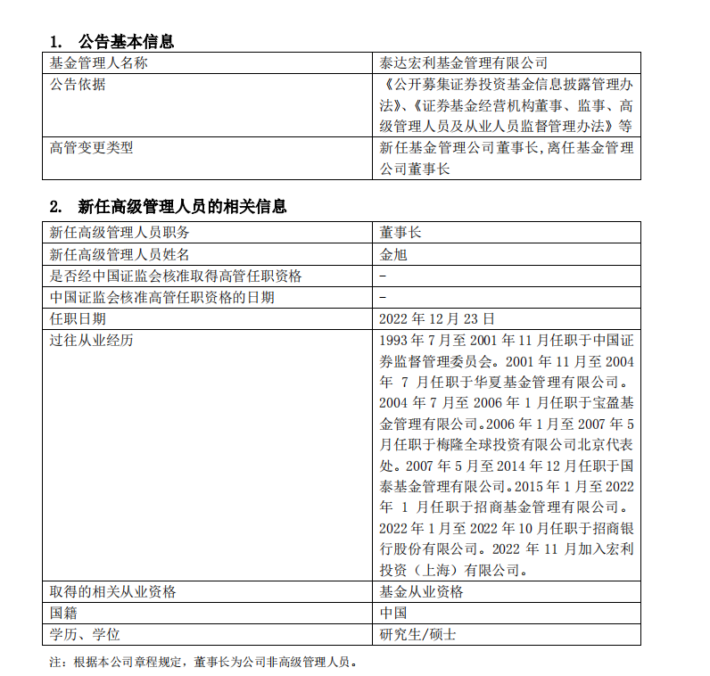 12月23日晚间,泰达宏利基金发布高管变更公告,公募老将金旭和高贵鑫已于12月23日正式屡新泰达宏利基金,分别担任公司董事长和总经理一职。原董事长傅国庆因董事会改组的原因离任。