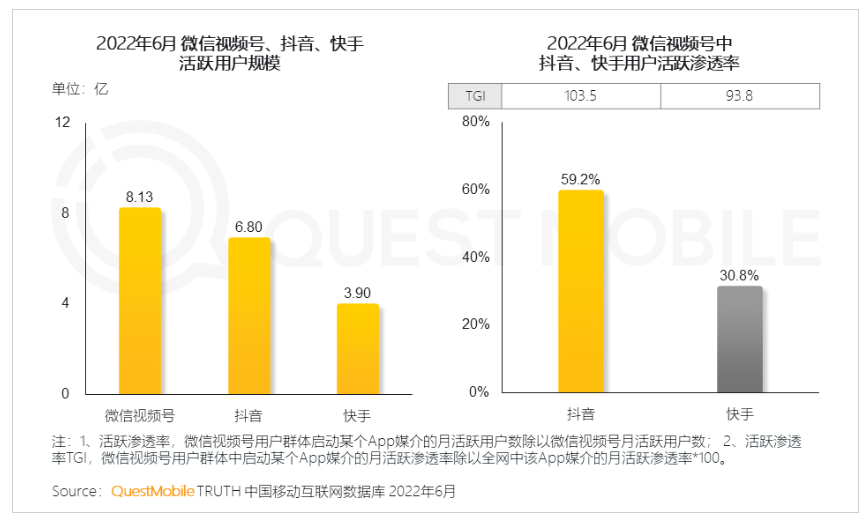 根据最新数据报告,截至2022年6月微信视频号的月活规模突破了8亿,超过了抖音的6.8亿和快手的3.9亿,成功打破了短视频的格局,跃居一位。