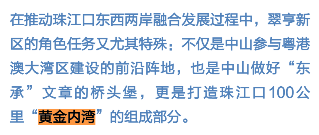 其中更提到:中山翠亨新区,不仅是大湾区建设前沿阵地,更是珠江口100公里“黄金内湾”组成部分。
