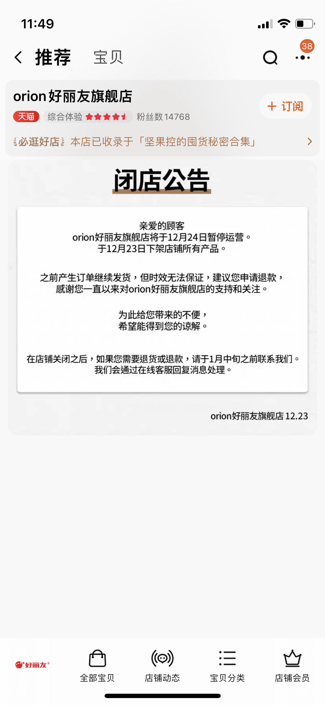 12月24日,经查询发现,orion好丽友天猫旗舰店发布闭店公告,orion好丽友旗舰店于12月24日暂停运营,于12月23日下架店铺所有产品。