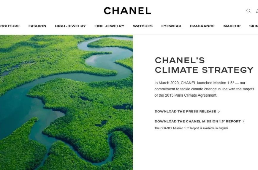 还有奢侈品牌Chanel发布的「Chanel 1.5°气候使命」的环保承诺中,便包括减碳、资助恢复森林、泥炭地等环境类项目的内容。