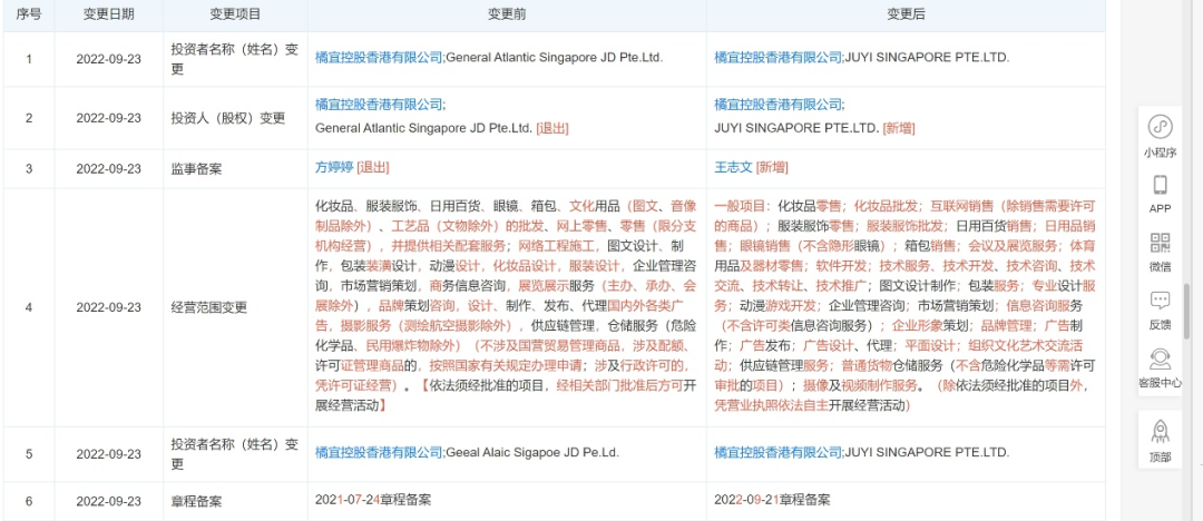 「子弹财观」发现,除了去年7月、9月发生股权变更外,今年9月,橘宜还发生了一系列股权变更,2022年9月23日,泛大西洋资本退出,橘宜集团控股股东变更为橘宜香港和橘宜新加坡。