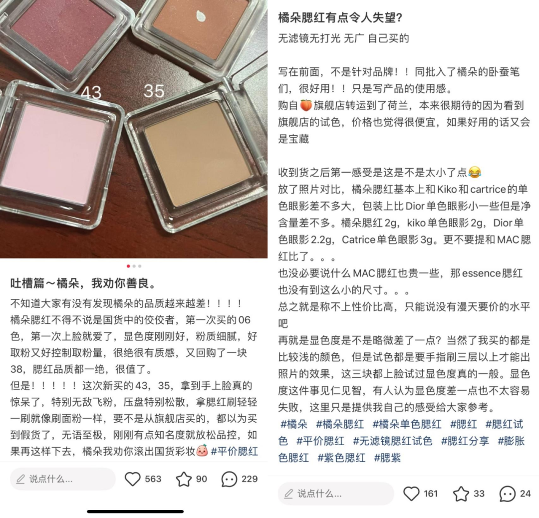 「子弹财观」注意到,小红书的用户对橘朵的吐槽也不鲜见,主要包括显色度差、持久度差、腮红飞粉等问题。