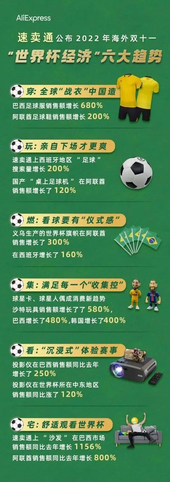 借着2022年卡塔尔世界杯的东风,球星卡的热度达到的新的高度,印有参赛足球明星的卡片价格也一路水涨船高。阿里旗下的速卖通公布了2022海外双十一“世界杯经济”的六大趋势中,指出球星卡成为消费新趋势。
