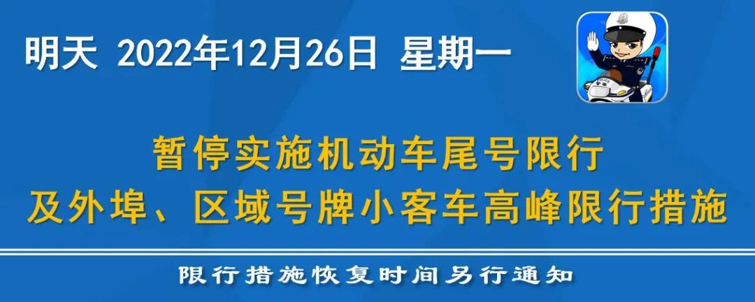 据“天津交警”微信公众号消息,12月26日,天津暂停实施机动车尾号限行及外埠、区域号牌小客车高峰限行措施,限行措施恢复时间另行通知。