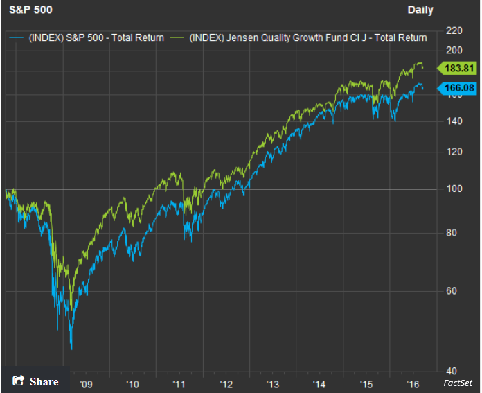 詹森基金的投资经理艾伦·邦德(Allen Bond)称,比较基金与指数表现最好的方法就是“在一个完整的市场周期中衡量投资回报”,即从峰值到峰值。在最近一次经济衰退前,标普500指数的上一个收盘高点出现在2007年10月9日。最近一次则是出现在2016年8月15日。在这轮股市周期中,詹森基金跑赢大市。