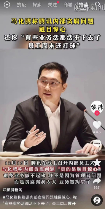 近日,媒体披露,腾讯公司12月15日召开线上内部员工大会,会上马化腾表示,内部贪腐问题“真的是触目惊心”,“很多业务做不起来并不是管理者问题,而是贪腐漏洞太大,业务被掏空了”。