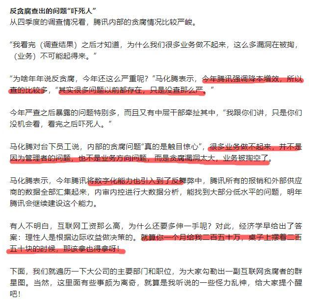 相关信息表明,对于腾讯内部的腐败问题,马化腾及其核心管理团队,不是不知道,应该是一直都保持着密切的关注,对于内部腐败问题,应该有一个基本的画像和研判,毕竟多年来,腾讯公司内部保持着年年有一定力度反腐败的工作。且定期对外有一些反腐败案件的通报。