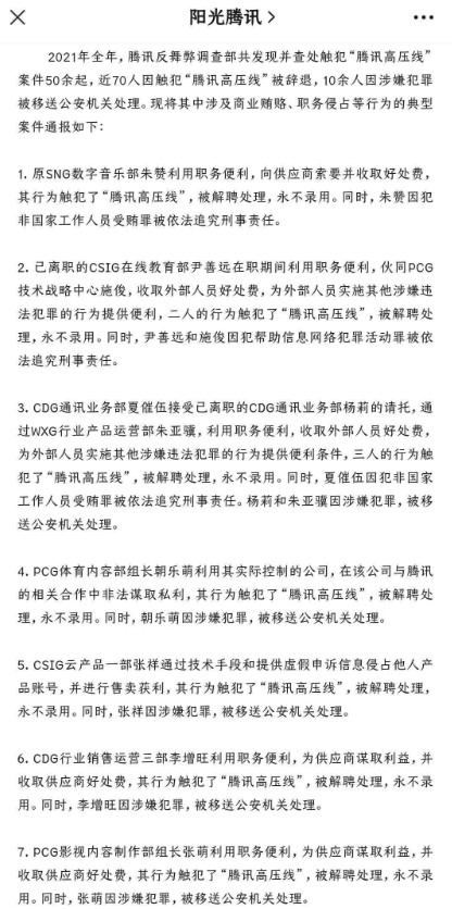 从腾讯公司公开发布的内部反腐案例来看,相比其他互联网公司,其内部反腐败的力度应该是比较大的。这从“阳光腾讯”公众号阳光通报栏目下2022年1月25日发布的《腾讯集团反舞弊通报》中可以感受到。通报指出,腾讯公司2021年全年发现并查处触犯“腾讯高压线”案件50余起,近70人因违规被辞退,更有10余人因涉嫌犯罪被移送公安机关处理。2022年度相关工作情况相信很快就会发布通报,而从马化腾的内部讲话来看,有理由认为2022年度腾讯公司的反腐败成效会比2021年更大。