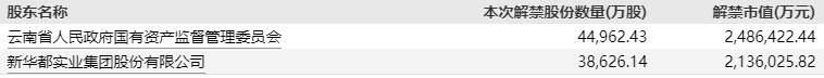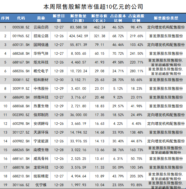 根据计划,12月27日中药龙头云南白药有8.36亿股定增限售股上市流通,占总股本比例的46.52%,是解禁前流通盘的98.47%,约合解禁市值462.24亿元。