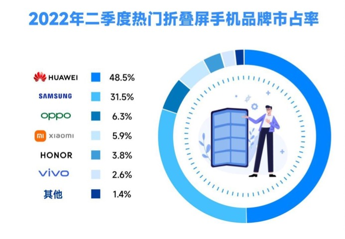 根据每日互动的数据显示,2022年4月1日至2022年6月30日之间,国内折叠屏手机销售量,华为销售数量占到市场的48.5%。其中华为P50 Pocket折叠手机,位居折叠屏手机销售量第一,销售数量占市场总量的21.5%。