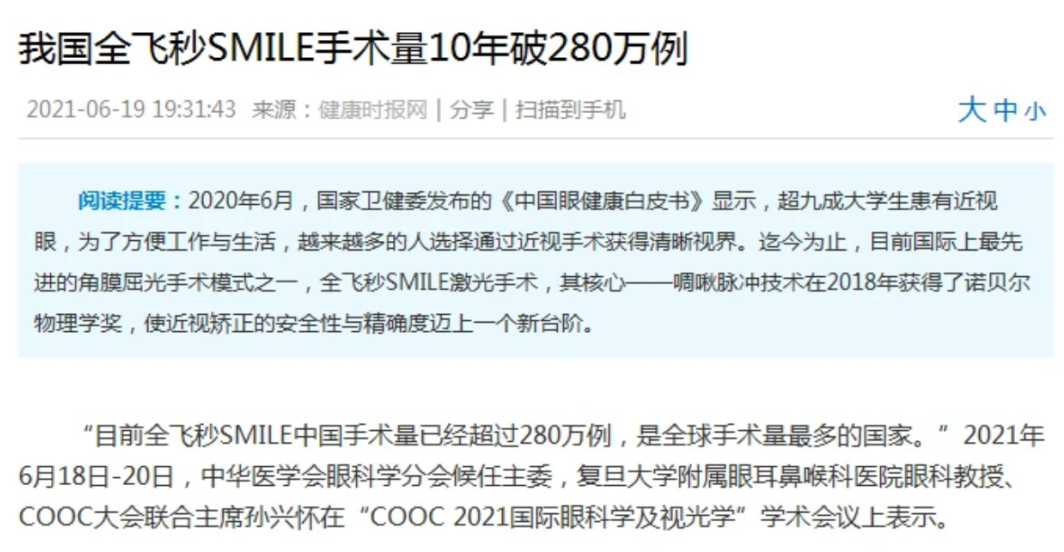 据BT财经了解到,截至2021年,中国全飞秒手术量10年来已破280万例,全国激光手术摘镜人数累计突破700万人。仅在深圳,每年就有近10万人通过飞秒手术摘镜。《健康时报》在2021年还专门对此作过专题报道。