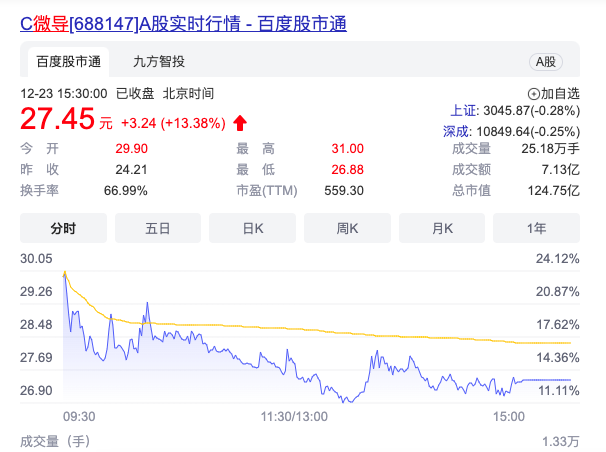 12月23日,光伏设备生产商微导纳米登陆科创板,首日上涨13.38%,总市值124.75亿元。