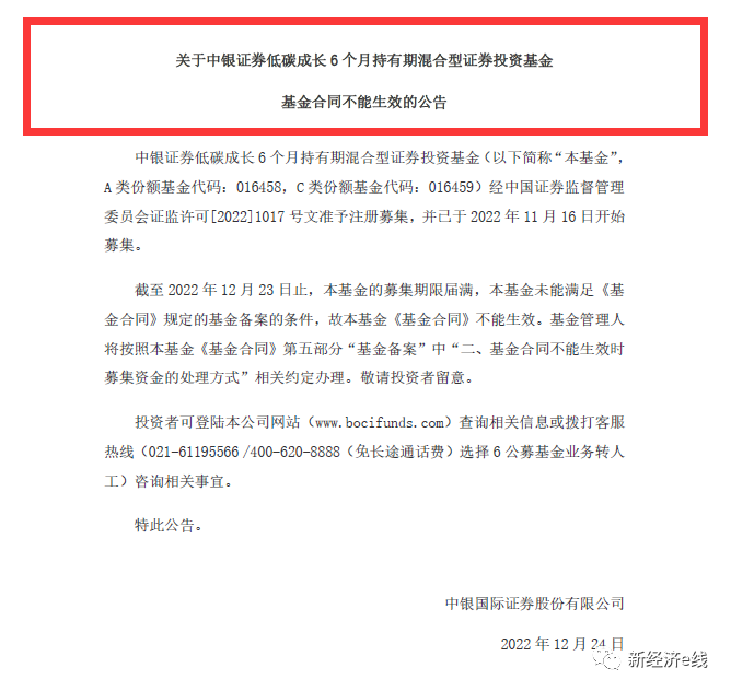 2022年12月24日,中银证券低碳成长6个月持有A发布关于中银证券低碳成长6个月持有期混合型证券投资基金基金合同不能生效的公告称,中银证券低碳成长6个月持有(A类:016458,C类:016459)经中国证监会证监许可[2022]1017号文准予注册募集,并已于2022年11月16日开始募集。