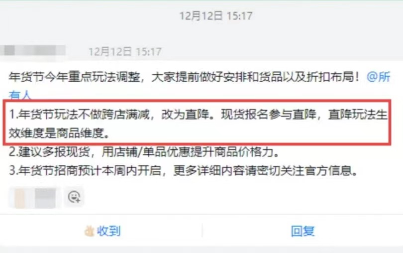 据多位知情人士透露,今年淘宝、天猫的年货节(12月29日至1月4日),促销不再发放购物券或跨店满减,而是变成官方直降立减5%-15%。消费者无需凑单也能享受让利,商家可拿单品报名参与活动,而非强制全店参与。