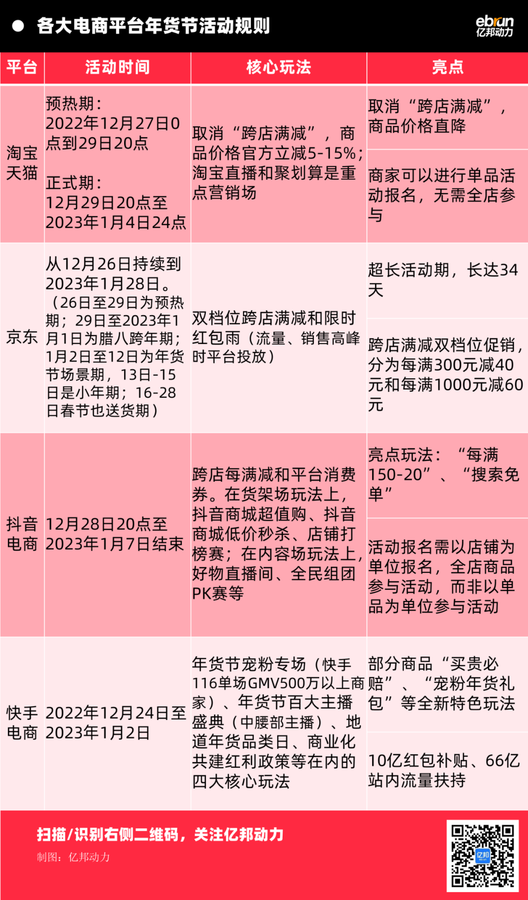 比如京东,将活动时间拉长至34天,从12月26日到2023年1月28日,并开启双档位满减(每满300元减40元和每满1000元减60元);抖音好物年货节从12月28日开始,1月7日结束,进一步拉低满减门槛至每满150元减20元;快手年货节开始得最早,12月24日至1月2日为正式活动期。