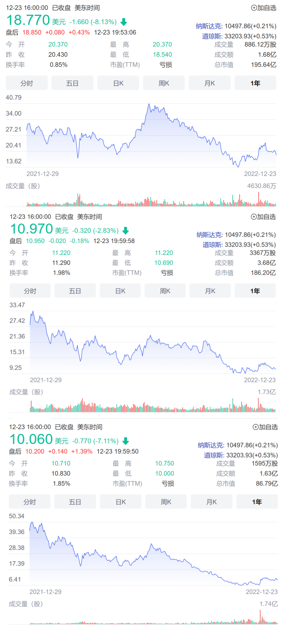 自上而下分别为:理想、蔚来、小鹏一年来美股股价走势