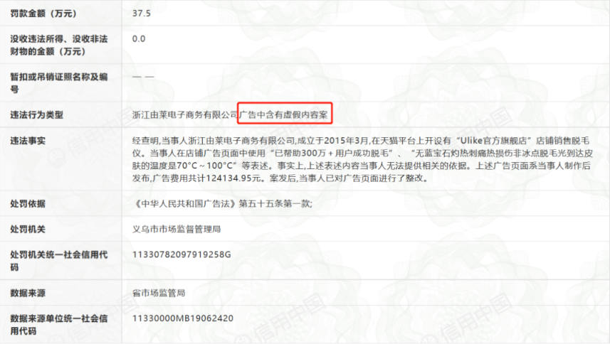 近日,信用中国网站信息显示,脱毛仪品牌Ulike的关联公司浙江由莱电子商务有限公司,因发布的广告中含有虚假内容,被罚款37.5万元。