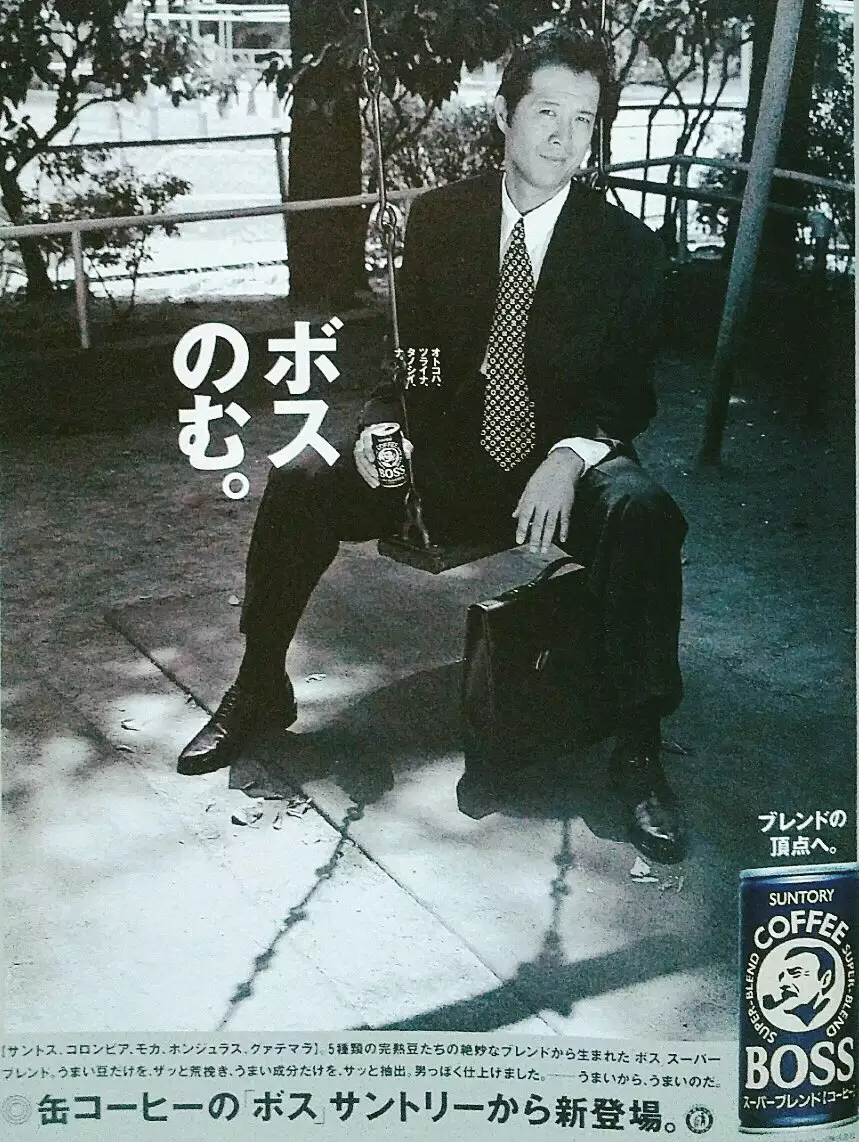 鲜少在电视广告中露面的矢沢永吉,在BOSS的广告里扮演了一位朴素的上班族,穿着板正的通勤西装,抱着公文包,手里拿着BOSS的咖啡,有时嘴里嘟囔着“糟了,真伤脑筋”,和大街上随处可见的上班族如出一辙。