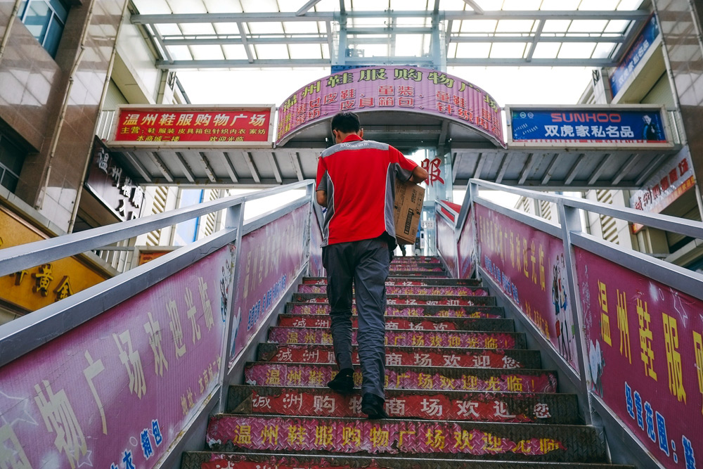 送货是平凡而重复的劳动。这一天,李文和先到了温州鞋服购物广场,这座楼梯不知上下了多少回。环城东路的天合商贸城聚集着不少客户,多数是在这里做鞋服生意的温州人,价格便宜、售后有保障的小型电器颇受他们青睐。