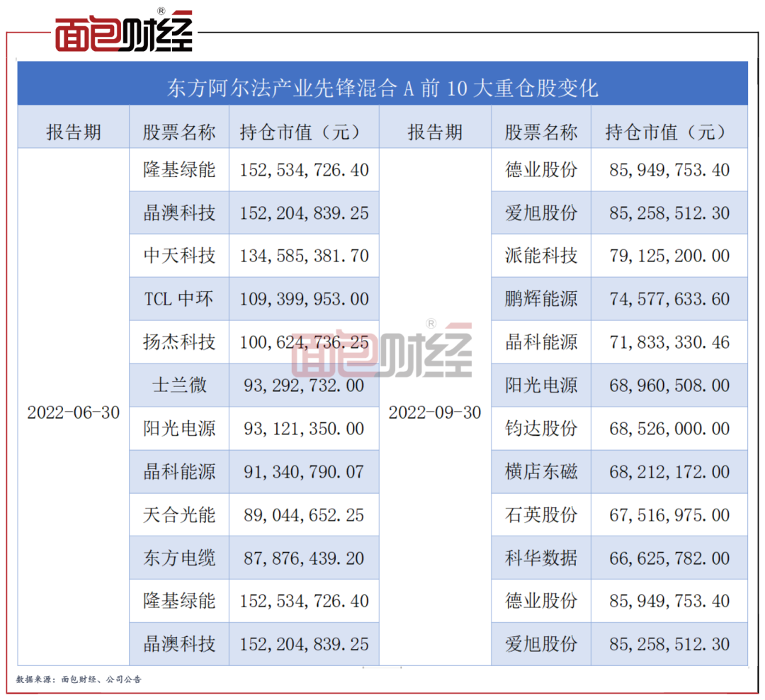 例如,2022年中报持有的10大重仓股在三季度有8只被换掉,其中包含持仓比例最高的前6只股票。