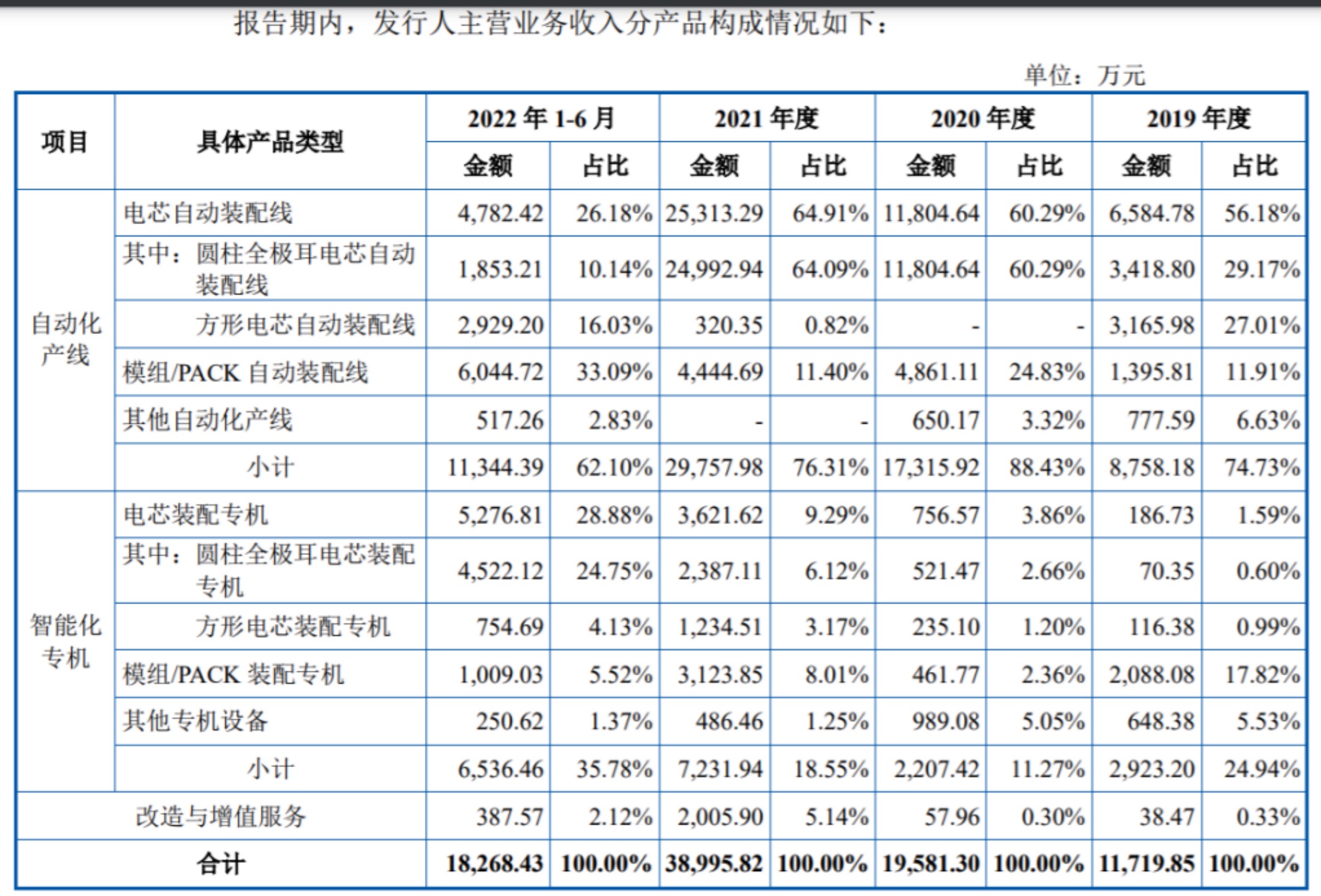 从主营业务上看,逸飞激光主要拥有自动化产线和智能化专机等两大业务,其中自动化产线产生的销售收入报告期内分别为8758.18万元、1.73亿元、2.98亿元、1.13亿元元,分别占当期主营业务收入的74.73%、88.43%、76.31%、62.1%,已成为公司第一大业务。