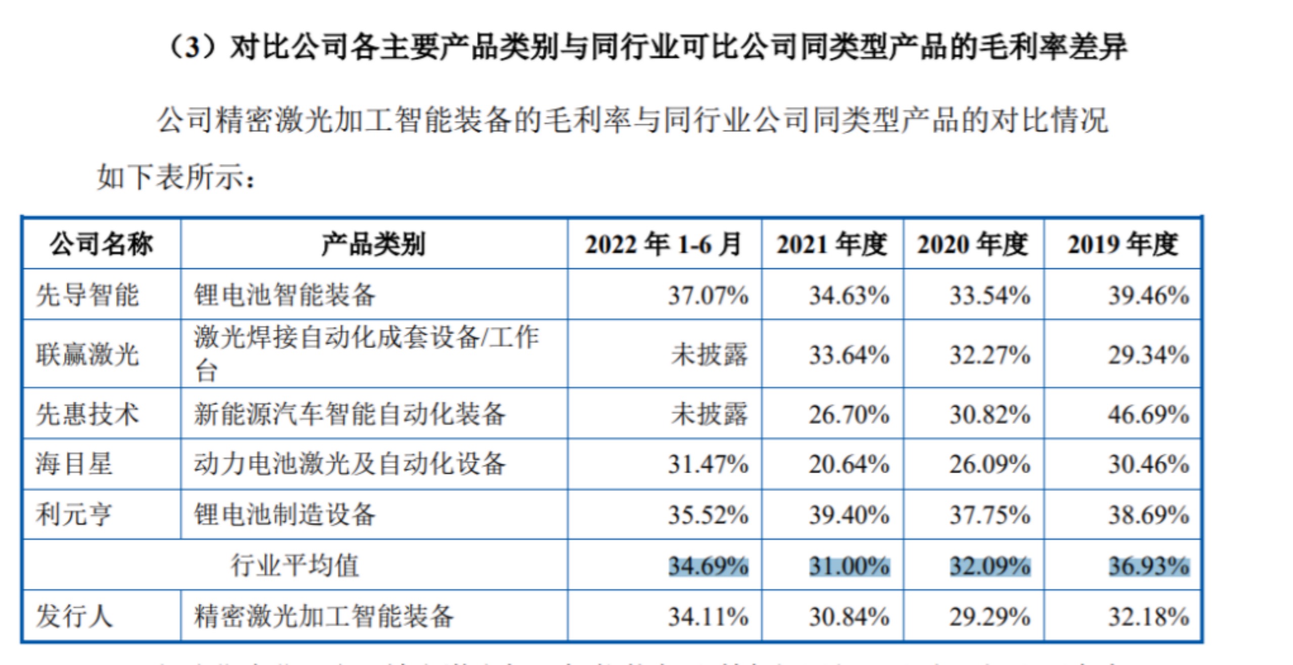具体在圆柱全极耳电芯自动装配线方面,2020年、2021年,宁德时代相关产品毛利率为11.52%、25.96%,国轩高科2019年、2020年相关产品毛利率分别为29.27%、25.16%,而江苏普亚等客户相关产品则在30%-60%之间;