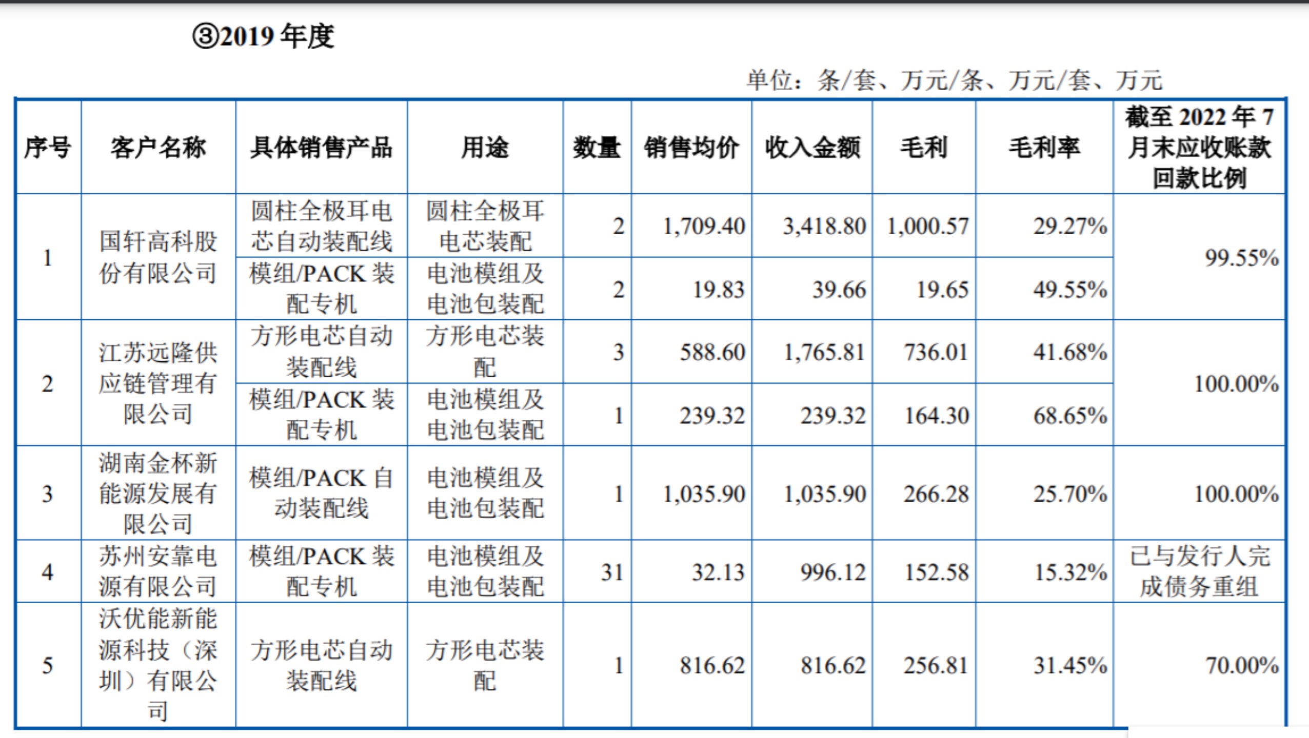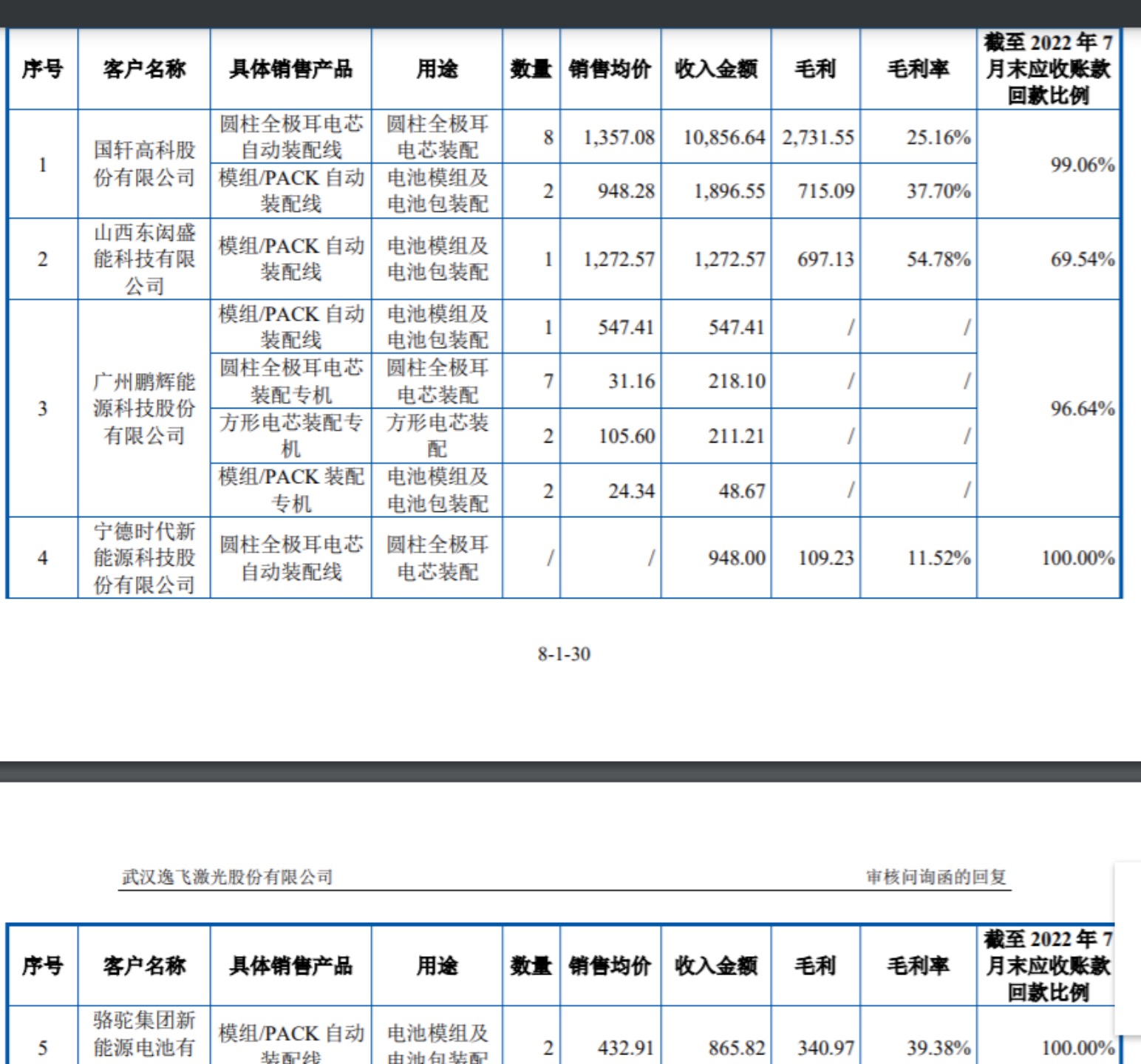 在最新一版上会稿中,逸飞激光也称圆柱全极耳电芯自动装配线、圆柱全极耳电芯专机在2020年、2022年上半年毛利率较低,主要系与其大客户国轩高科就车辆回款事项达成一致以及国轩高科采购规模大、定价有所降低所致。