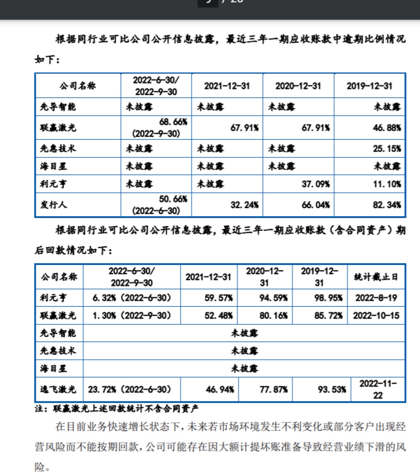 据最后一轮问询回复函披露的数据,2019年至2022年上半年,逸飞激光应收账款(含合同资产)的账面价值分别为 8570.76 万元、7176.23 万元、17504.81 万元及 17827.39 万元,占流动资产的比例分别为16.59%、12.42%、21.16%及 16.77%。其中,公司逾期应收账款占比分别为82.34%、66.04%、32.24%和 50.66%。
