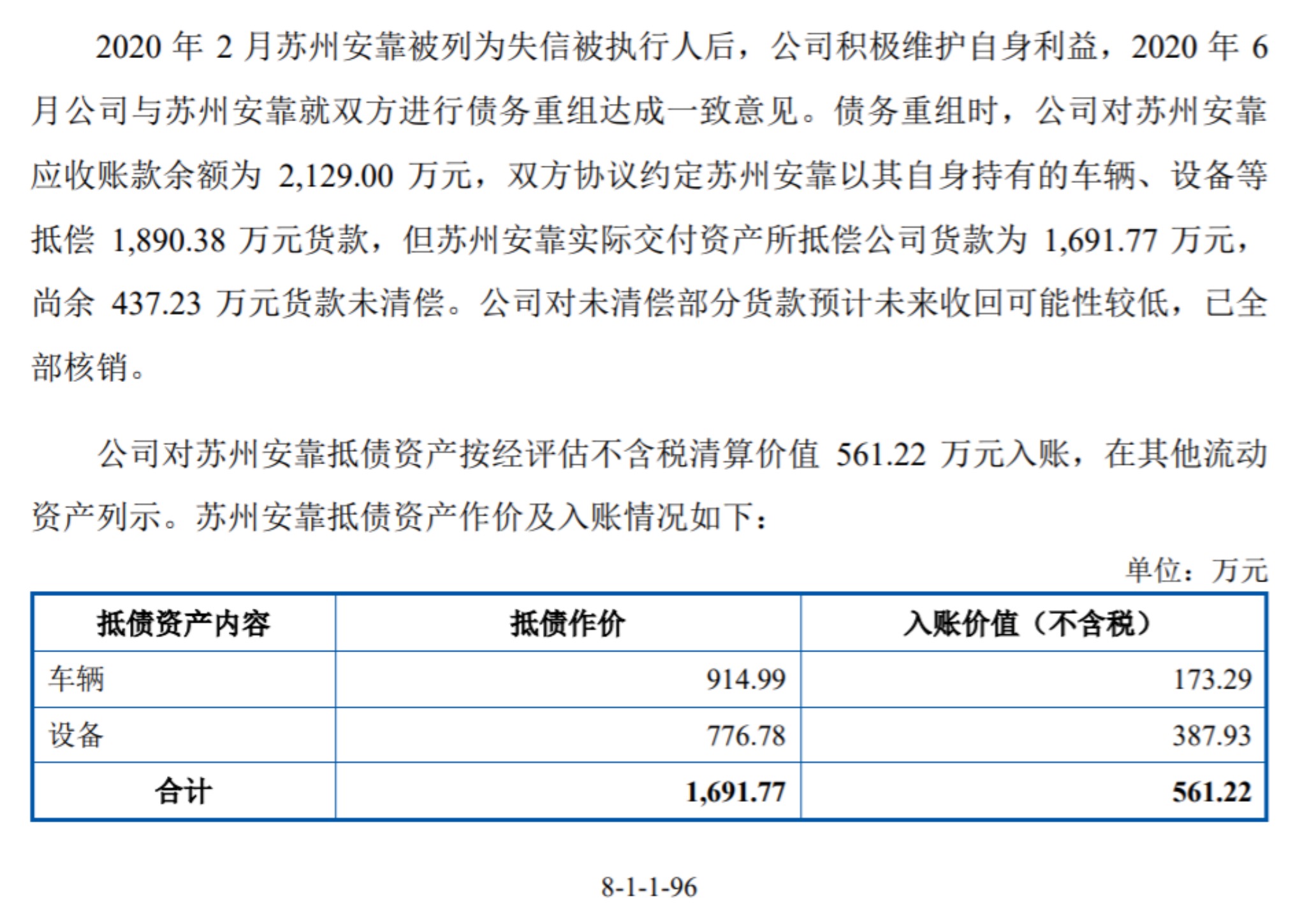 比如在偿还供应商货款方面,逸飞激光便曾将苏州安靠的86 辆抵债车辆于 2020 年度、2021 年度分别处置 23 辆、63 辆给公司供应商,以抵偿应付货款。在这一模式下,逸飞激光根据车辆的市场行情确定车辆入账价值,并将后续所抵偿应付供应商货款与车辆入账价值之间的差额,确认为债务重组损益。