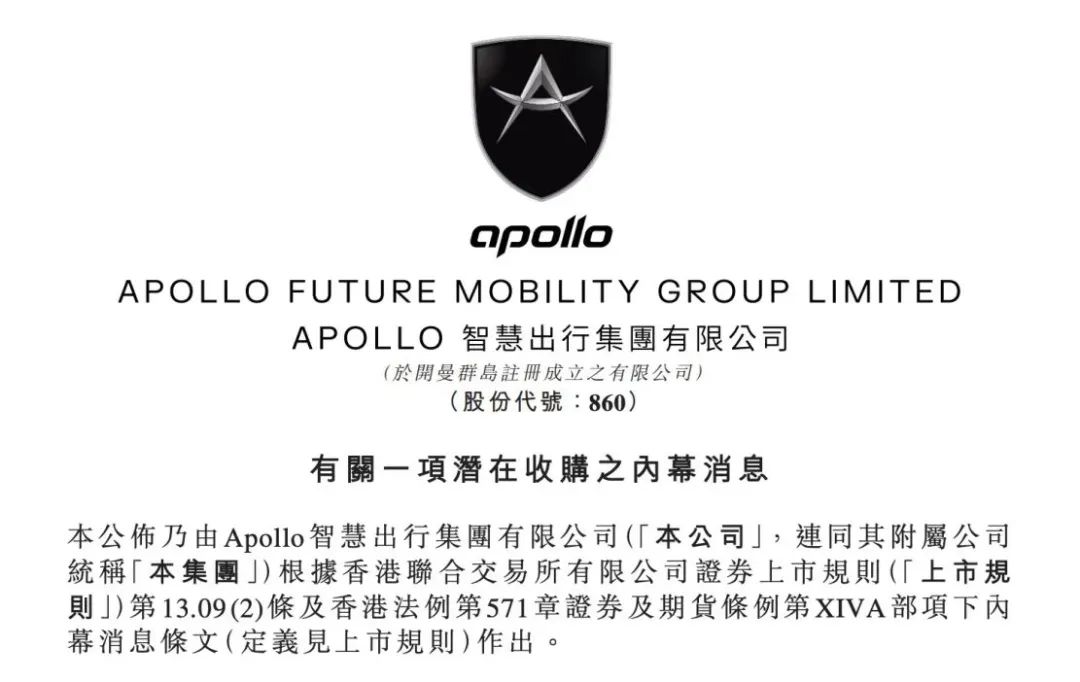 12 月 5日,Apollo 出行在港交所发布公告称,公司目前拟收购一家从事智能电动车的公司。目标公司的业务涵盖一系列配备先进技术的智能电动车,目标客户为中国年轻且精通技术的用户。