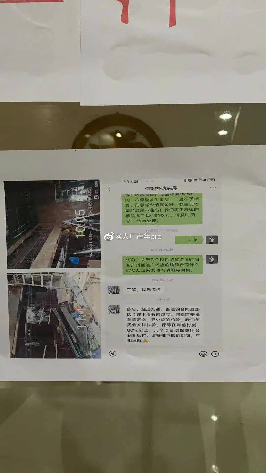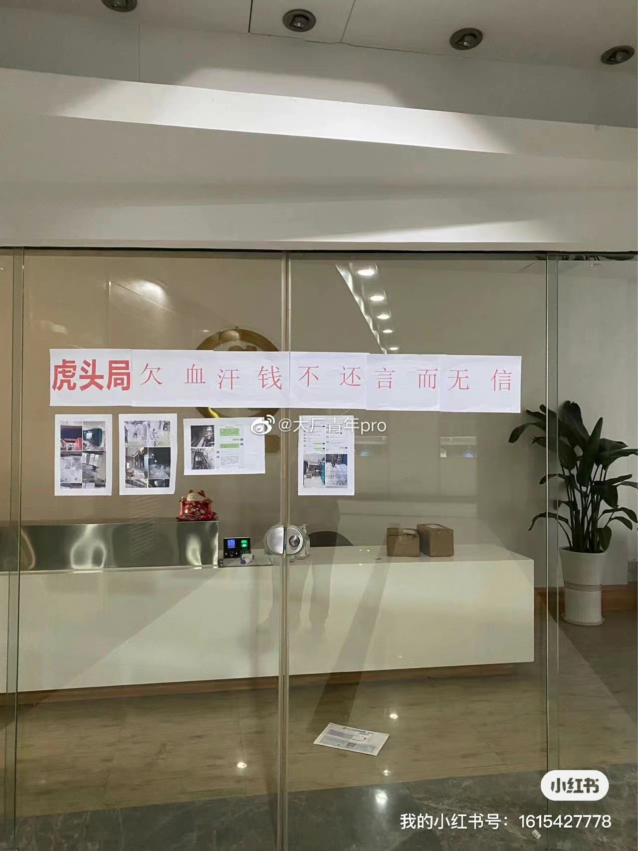 此外,虎头局位于广州珠江新城的办公室门口被贴上了拖欠装修款的大字报,从微信截图可以隐约看出,工程方要求虎头局结清深圳壹方天地门店、广州百信广场门店的工程款。