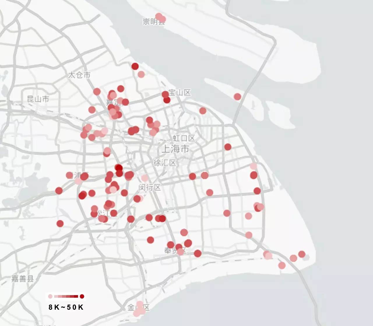 当这个图片出现在眼前时M君是绝望的,单价五万以下的项目散布在魔都的外环以外,外环以内仅有大场板块拥有一些单价较低的项目。红色越深,代表单价越接近5万,越浅代表单价越接近0.8万。虽然能满足小新要求的楼盘有150多个,但是大部分都集中在嘉定、泗泾、松江、奉贤等几个板块,单价在2.5万以上的项目占去了50%,个别项目单价也达到了4万以上;单价最低的几个项目主要是在金山和临港。