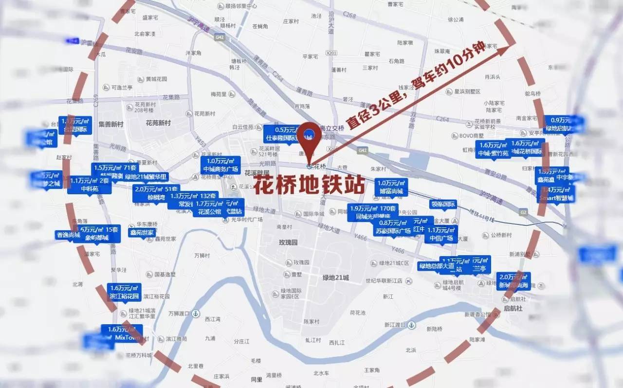 就剩花桥。花桥是属于昆山的没错,但是花桥可以乘地铁11号线到达,除了坐地铁比较久,要1小时40分钟,基本和通勤时间最长的嘉兴是一个水平。花桥的在售楼盘基本是围绕着花桥地铁站分布,距离越近单价越高,从1.1万到2万不等。