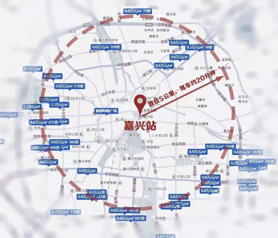 嘉兴距离上海90公里左右,虽然嘉兴到上海也有高铁发车,但奇葩的是嘉兴的高铁都是由嘉兴南站发车,而嘉兴南站附近几乎没有在售项目,所以我们把区域选在嘉兴站附近。在售楼盘集中在中环和外环之间,以城西和南湖新区为主,单价在7千到9千之间。
