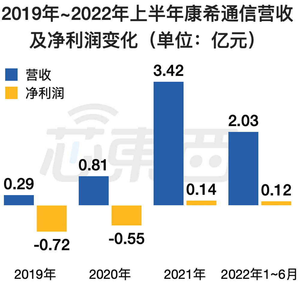 2021年以来,得益于下游Wi-Fi市场快速发展及我国芯片国产化进程加快,康希通信业绩进入快速增长期。2019年、2020年、2021年、2022年1-6月,其营收分别为0.29亿元、0.81亿元、3.42亿元、2.03亿元;净利润分别为-0.72亿元、-0.55亿元、0.14亿元、0.12亿元。