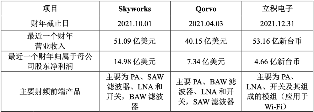 康希通信的毛利率低于Skyworks、Qorvo等境外同行业公司的毛利率,与立积电子基本一致。