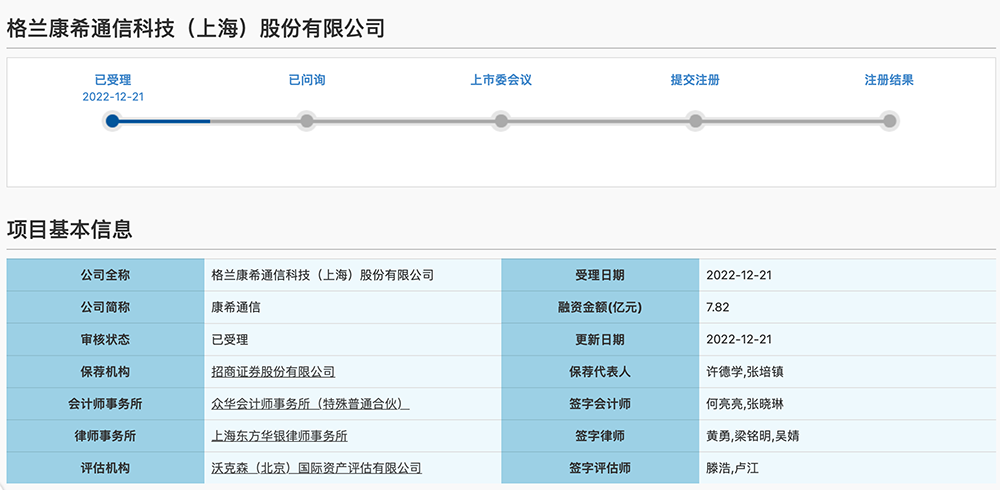上周三,射频前端芯片供应商格兰康希通信科技(上海)股份有限康希通信(简称“康希通信”)科创板IPO获受理。