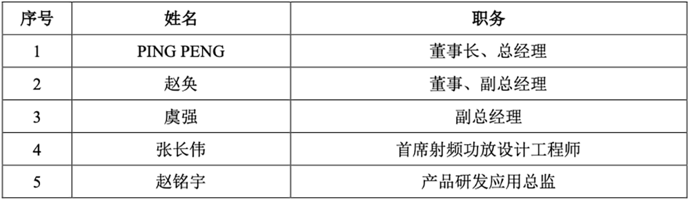 以PING PENG、赵奂、虞强等为核心的技术研发团队多毕业于上海交通大学、西安交通大学、电子科技大学、美国理海大学等国内外知名院校,具有RFaxis(2016年被Skyworks收购)、RFMD(已合并为Qorvo)、Anadigics等国际知名射频芯片厂商的工作经历,具备丰富的射频芯片研发经验及全球领先的技术视野。