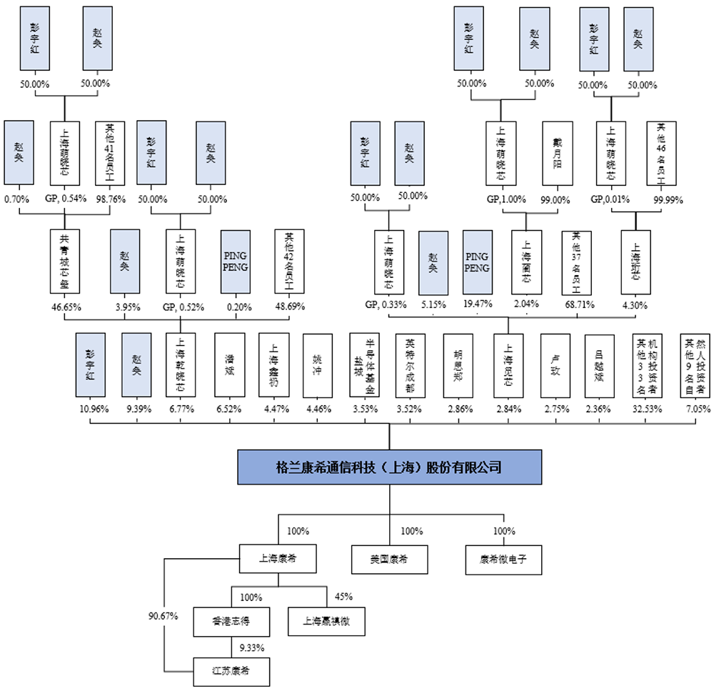 PING PENG、彭宇红与赵奂三人合计直接持有康希通信20.35%股份,并通过员工持股平台合计控制康希通信9.60%的股份,合计控制康希通信29.95%的股份对应的表决权。