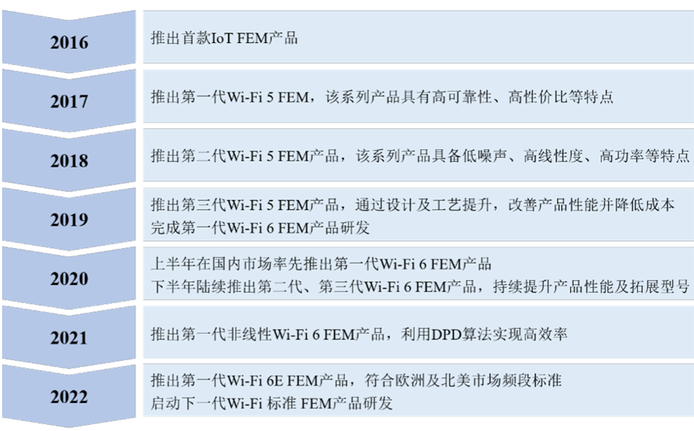 Wi-Fi FEM是应用于Wi-Fi通信的射频前端芯片模组,其性能影响用户使用Wi-Fi通信时的联网质量、传输速度、传输距离、设备能耗等。