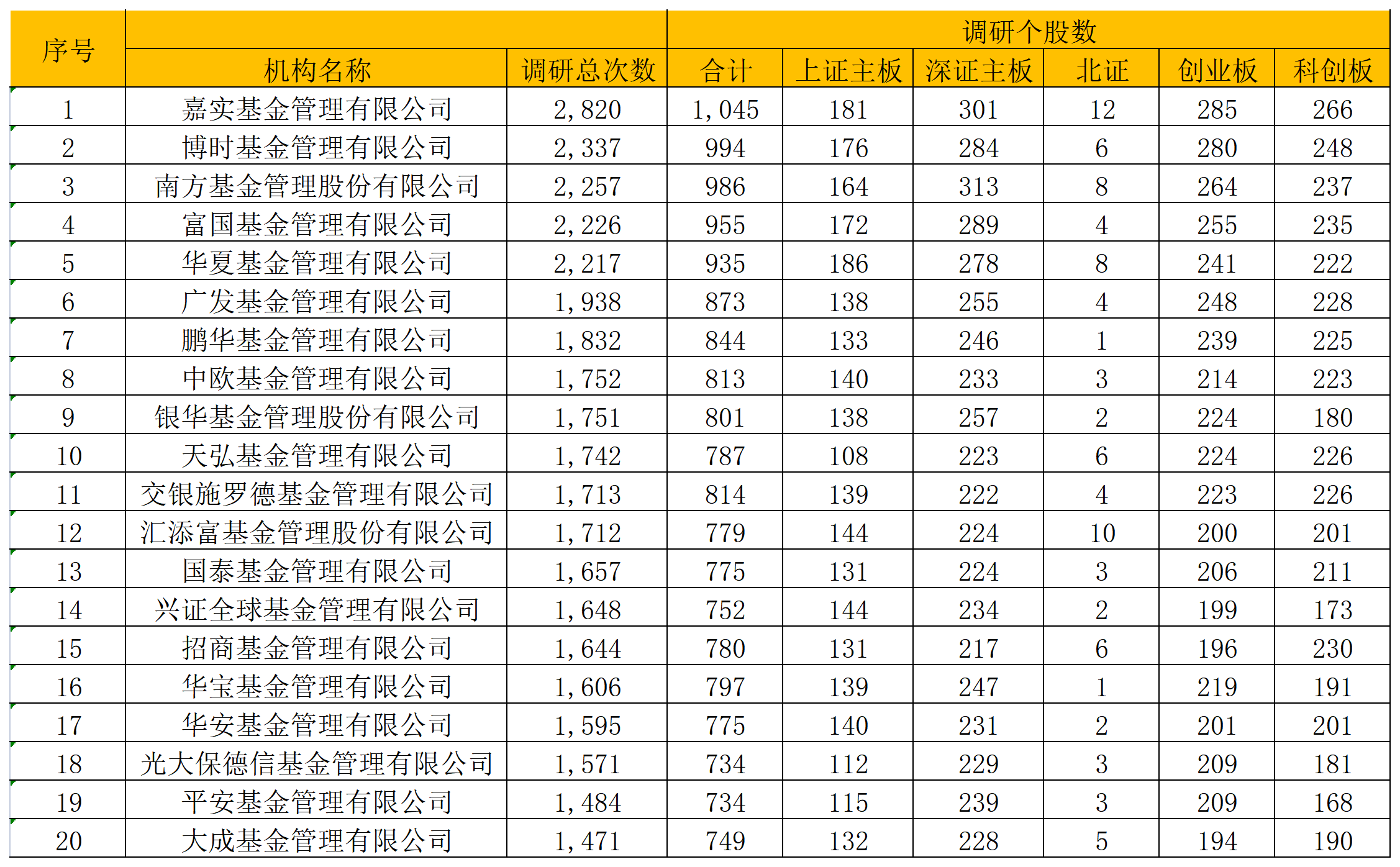 从参与调研的个股数量来看,深证主板、创业板、科创板的个股吸引了多数公募调研的目光。以嘉实基金为例,今年调研的1045只个股中,深证主板个股有301只、创业板个股有285只、科创板个股有266只。博时基金调研的2337只个股中,深证主板个股有284只、创业板个股有280只、科创板个股有248只。