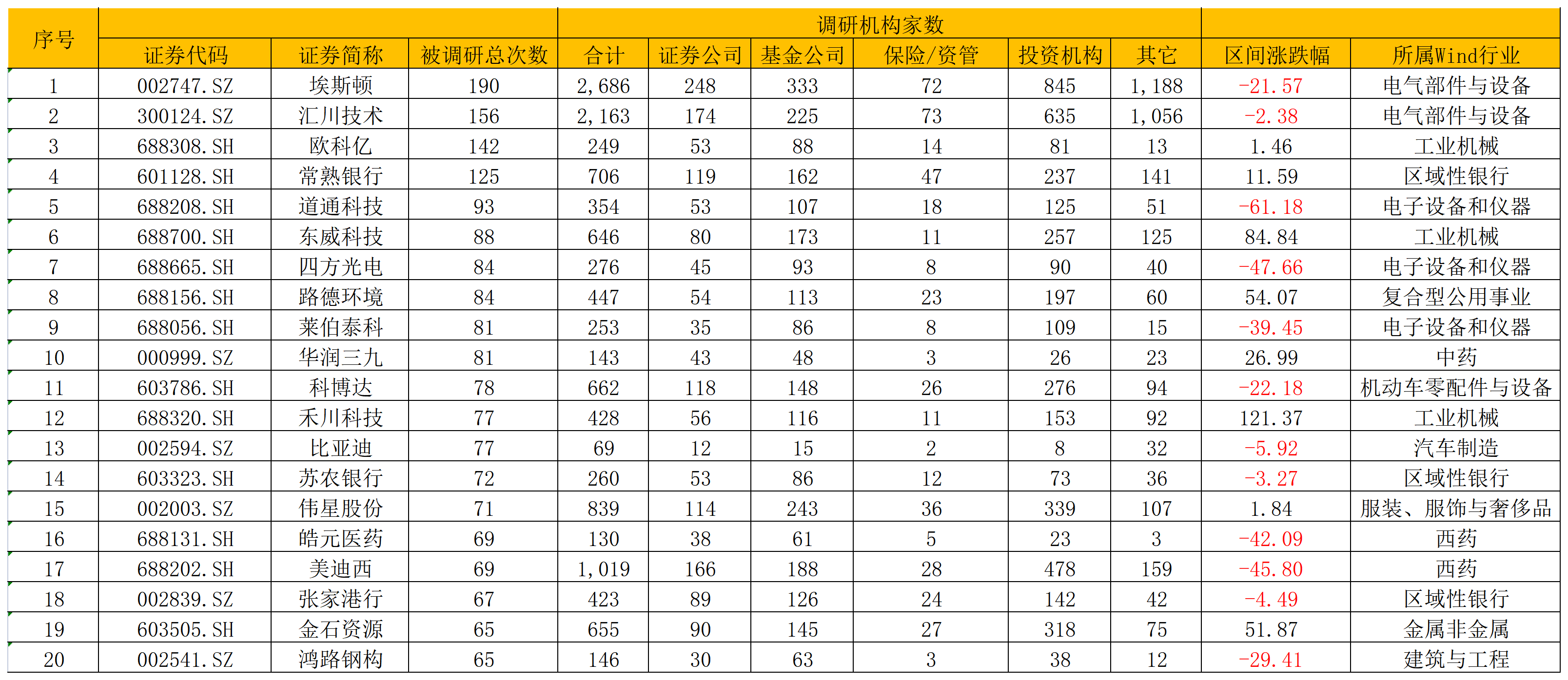 具体到个股来看,埃斯顿(002747.SZ)、汇川技术(300124.SZ)、欧科亿(688308.SH)、常熟银行(601128.SH)、道通科技(688208.SH)等5只个股今年内被调研的总次数最多,分别是190次、156次、142次、125次、93次。