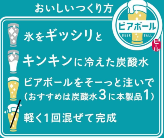据悉,这款名为“ビアボール(beer ball)”的啤酒是一款啤酒原液,不含碳酸水,啤酒中麦芽汁和果香较为浓郁,消费者可自行加入冰块或碳酸水进行稀释,不同搭配方式会产生不一样的饮用效果。