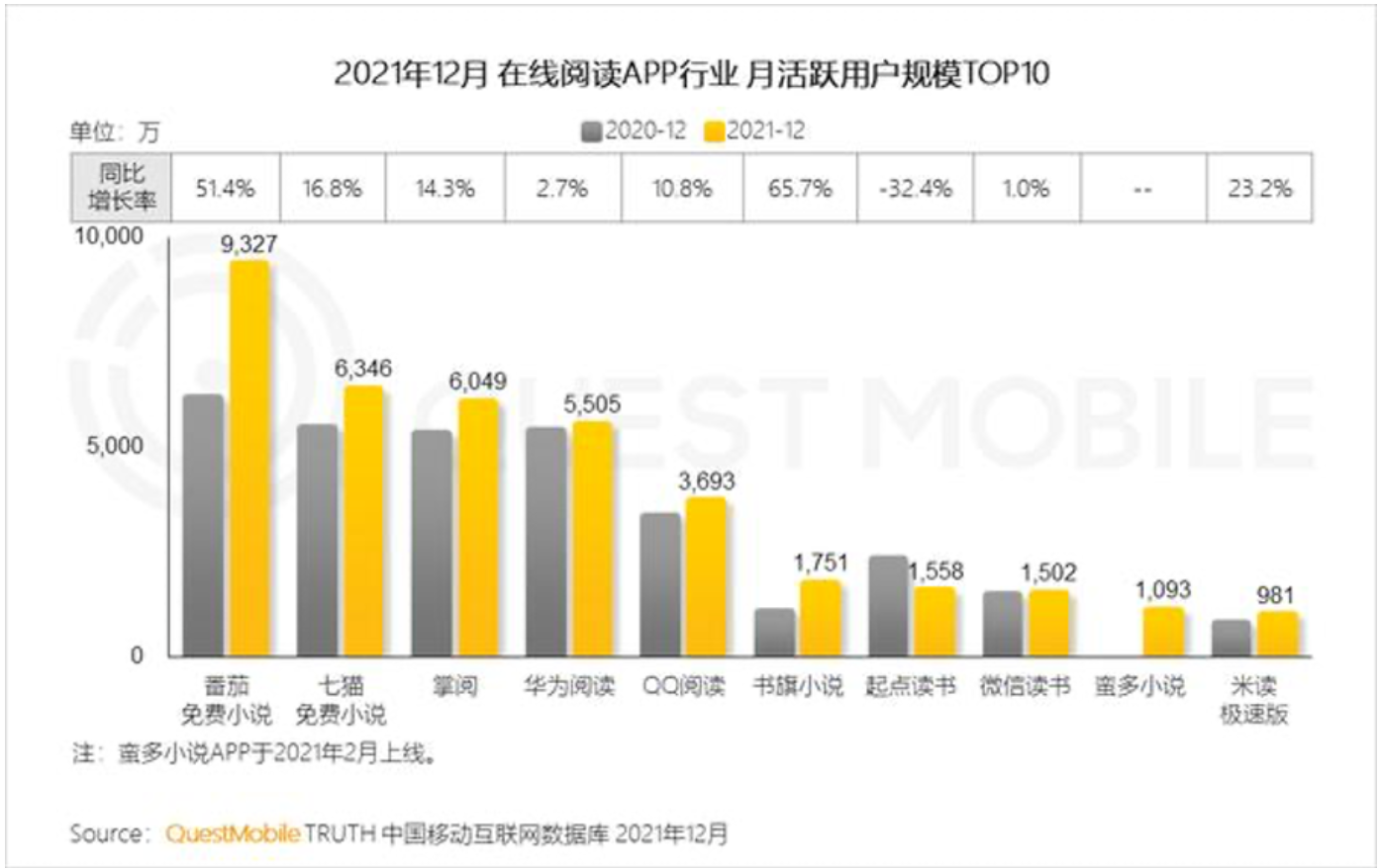 阅文旗下表现最好的,是排在第五的QQ阅读,其月活规模约为番茄小说的三分之一。