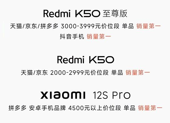 在小米今年双11战报中,Redmi K50取得了天猫/京东2000-2999元价位段单品销量第一、Redmi K50 至尊版取得了天猫/京东/拼多多3000-3999元价位段的单品销量第一,抖音销量第一。