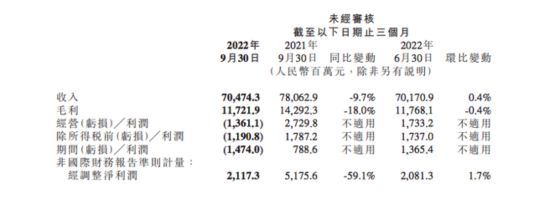 11月23日,小米发布今年三季度财报,财报显示,今年前三个季度,小米集团实现营收2139.96亿元,同比下滑11.80%;期内经调整净利润为70.57亿元,同比下滑59.8%;期内毛利润361.99亿元,同比下降17%。